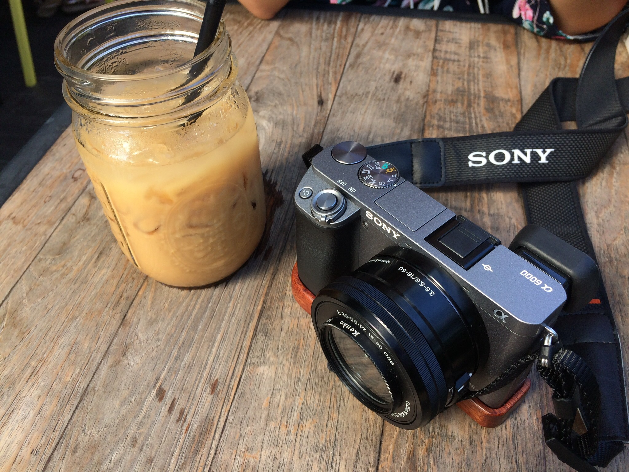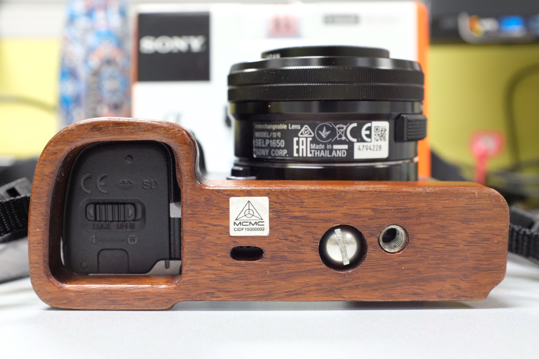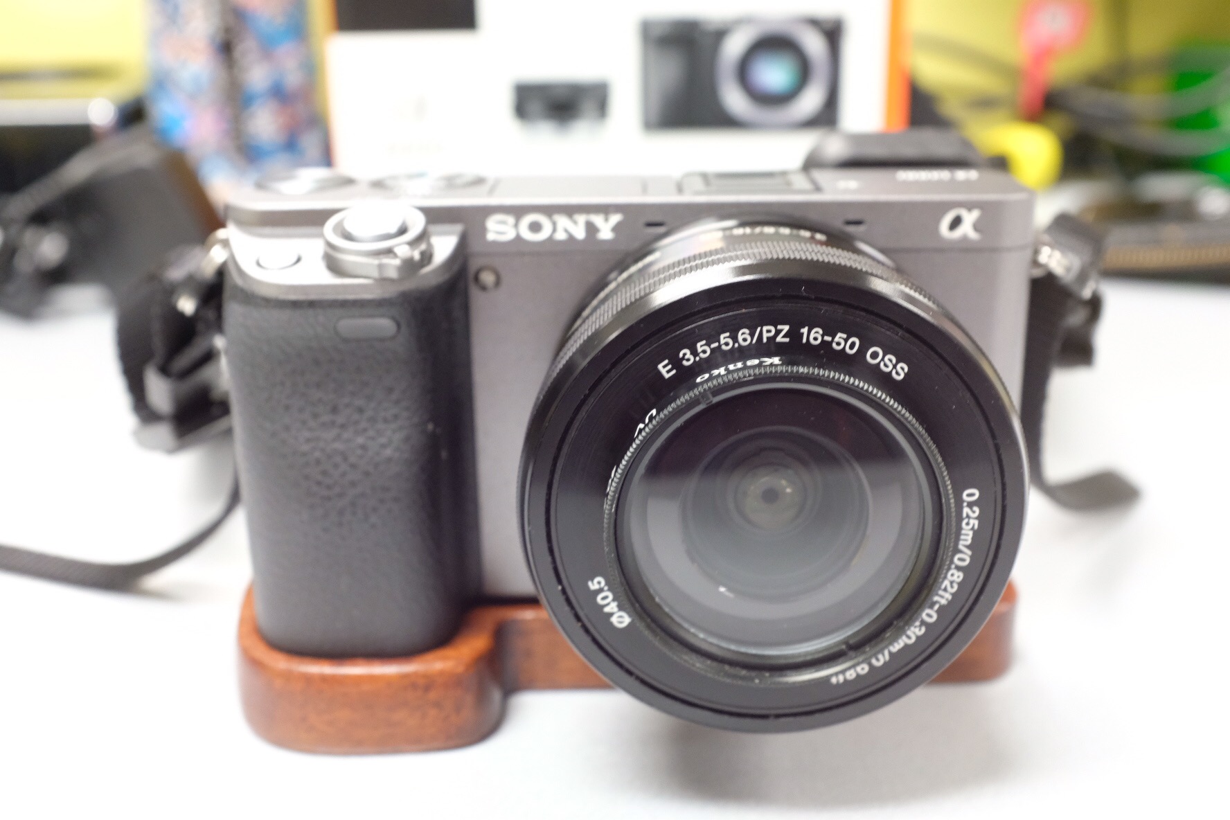 Full set of Sony A6000 with box, with a classical wooden grip.